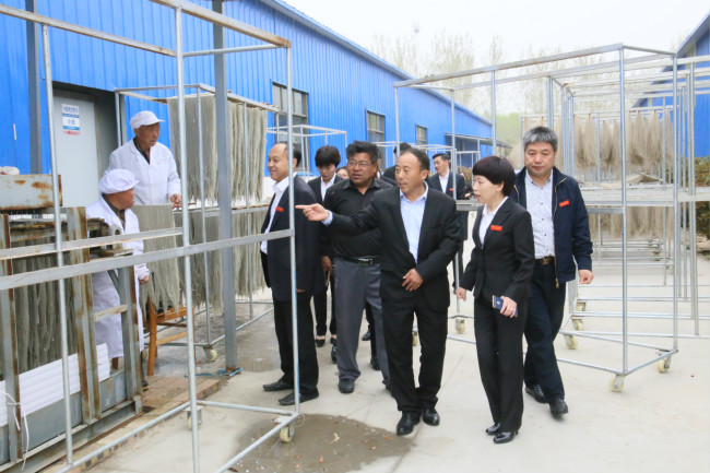 接着,赵书记带领大家参观了傅楼村扶贫产业粉条加工厂。赵书记对加工厂的生产、储存和销售等环节进行了介绍。参观结束后,各书记就粉条的加工、出售、包装等积极建言献策。