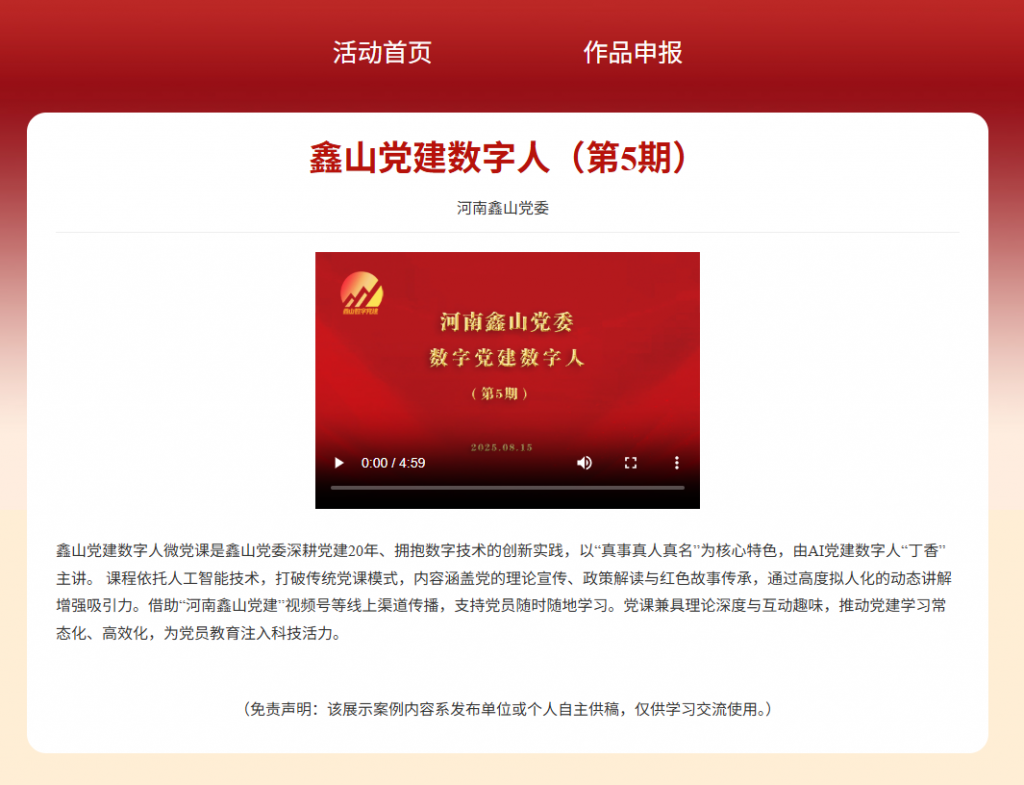 中国共产党新闻网是由中共中央批准,人民日报社人民网承办的新闻网站,是宣传和介绍中国共产党思想、理论、政策、信息的权威平台。今年7月至10月他们发起了全国精品微党课征集活动。活动以党的创新理论、红色历史、身边榜样和工作实践为核心主题,面向全国各领域基层党组织,征集纪录片、微电影、公开课、微访谈等多种类型作品,汇聚了全国各地众多优秀党建成果。鑫山党建数字人微党课第五期聚焦“党员干部为民办实事”主题,通过真实案例生动展现了身边党员干部以实干践行初心、用担当温暖民心的动人故事,凭借鲜明主题与创新形式脱颖而出。