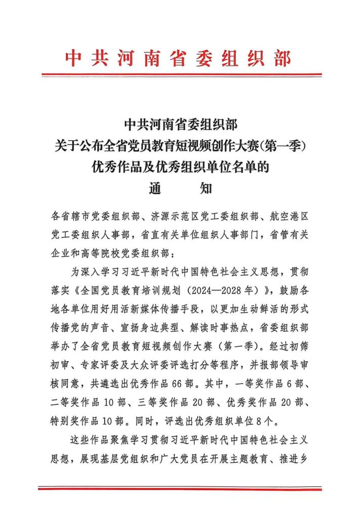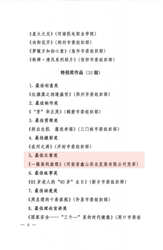 近日,河南省委组织部公布全省党员教育短视频创作大赛(第一季)优秀作品集及优秀组织单位名单,河南鑫山党委提报的参赛作品《一幅画的旅程》荣获最佳文案奖,为企业党建工作再添动力。
