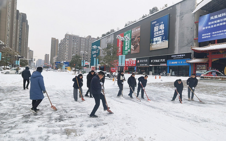 1月19日,郑州市迎来2026年首场强降雪,部分地区积雪达12到18厘米,河南省气象台持续发布道路结冰黄色预警。为保障员工、商家和凤凰城商场周边群众出行安全、筑牢安全防线,企业党委迅速行动,组织党员、员工和商家,开展“扫雪除冰保畅通”志愿服务活动。